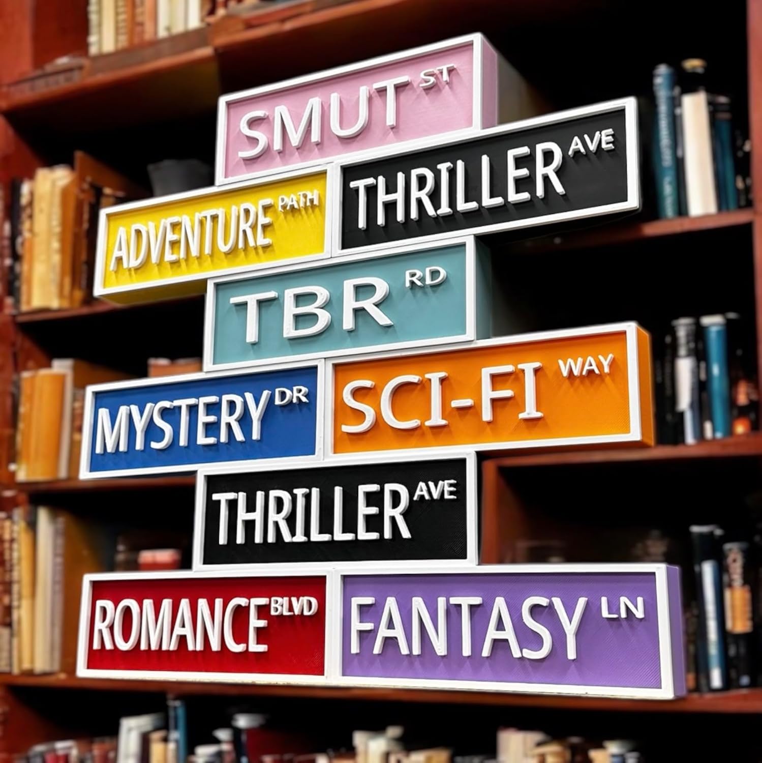Stylish & Unique Design: Inspired by real traffic signs, perfect for adding a fun, literary touch to your bookshelf or book nook. Durable & High-Quality: Made with premium matte-finish material and featuring a sturdy 0.8-inch thickness (22 mm) for long-lasting use. Lightweight & Versatile, can be displayed on shelves or walls. Signs do not include pre-drilled holes, but one can be added if needed. Perfect Gift for Book Lovers: A great conversation piece and an aesthetic way to showcase your favorite genres!